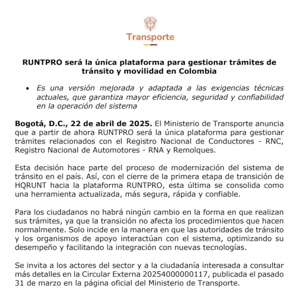 “Esta decisión hace parte del proceso de modernización del sistema de tránsito en el país. Así, con el cierre de la primera etapa de transición de HQRUNT hacia la plataforma RUNTPRO, esta última se consolida como una herramienta actualizada, más segura, rápida y confiable”, dice el comunicado oficial del ministerio.